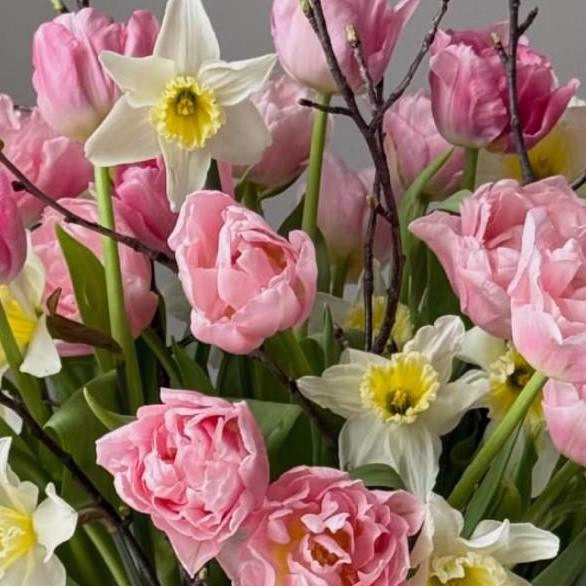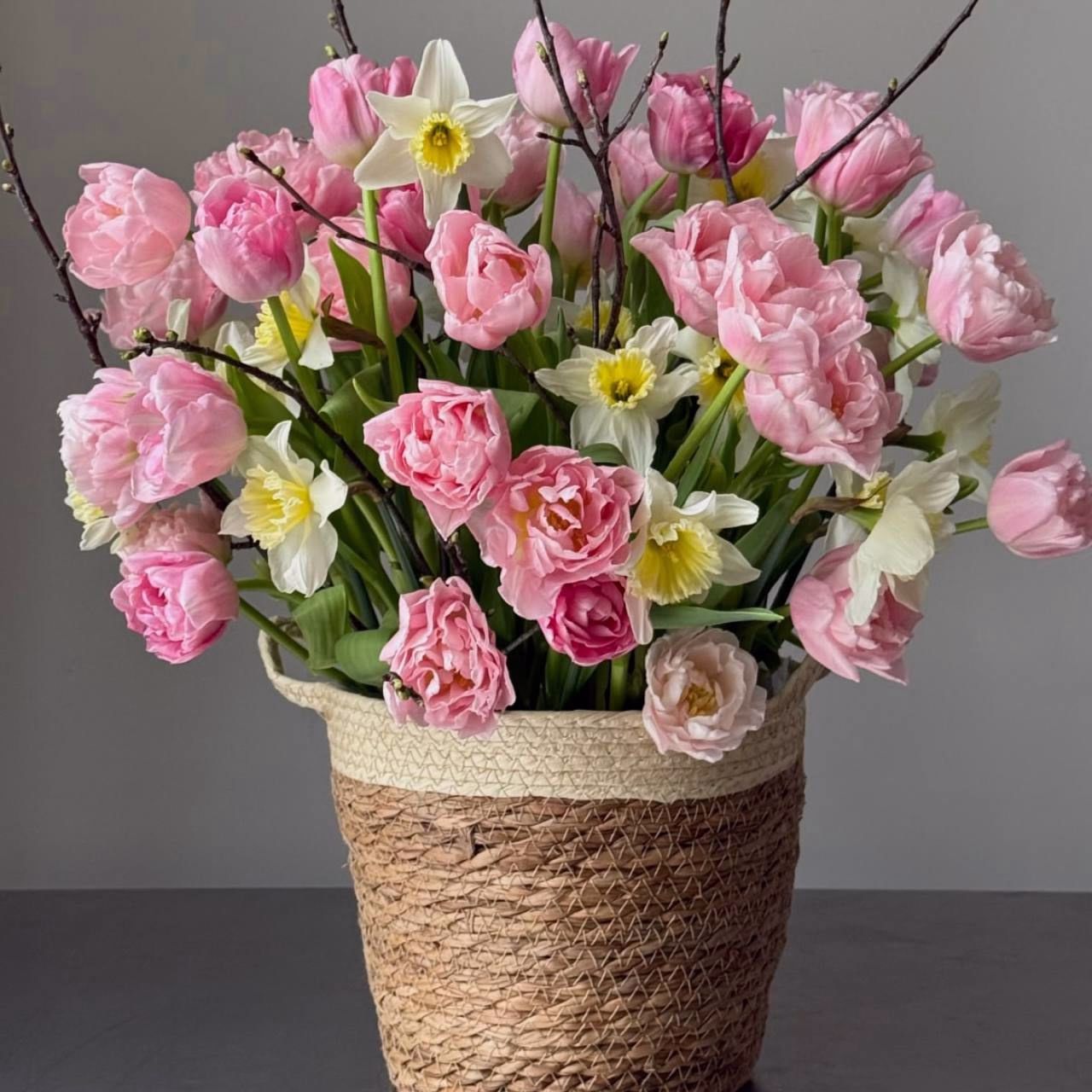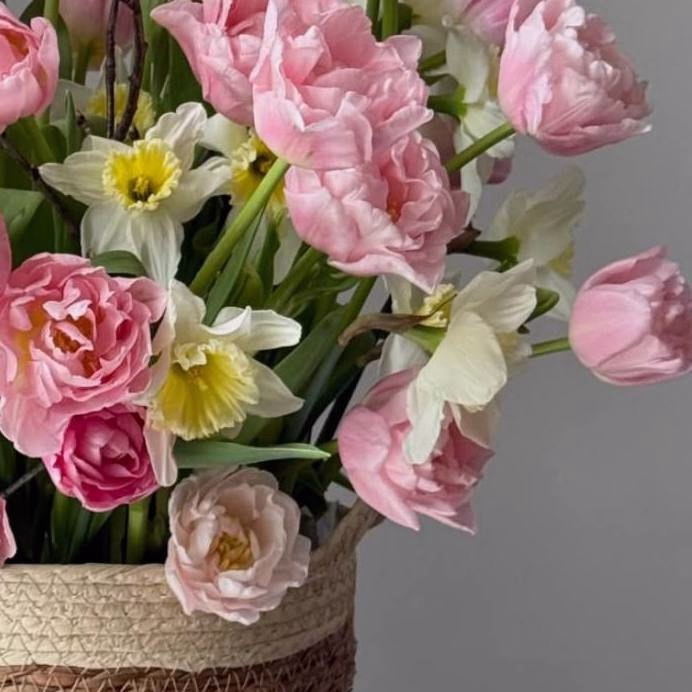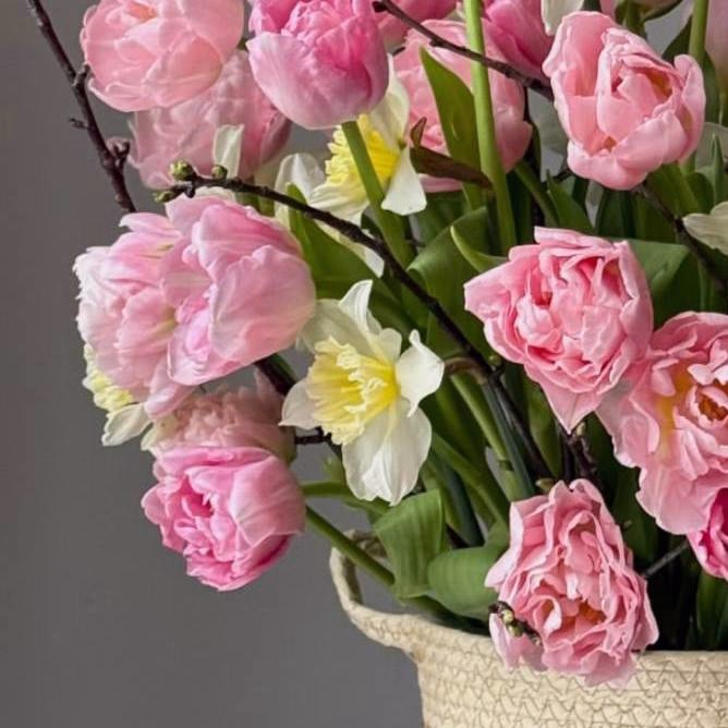 Утонченная и по-настоящему живая композиция в корзине, сочетающая в себе нежность розовых пионовидных тюльпанов и изящество белоснежных нарциссов. Добавление натуральных веточек придает букету особую природную эстетику, создавая образ цветущего весеннего сада. Эта корзина станет идеальным подарком на 8 марта, наполняя пространство свежестью, легкостью и атмосферой праздника. The Ame — цветочный магазин в Сочи, где можно заказать авторские букеты с доставкой от 60 минут по городу и в Адлер. Мы собираем композиции из свежих цветов и оформляем их в эстетичном, современном стиле.